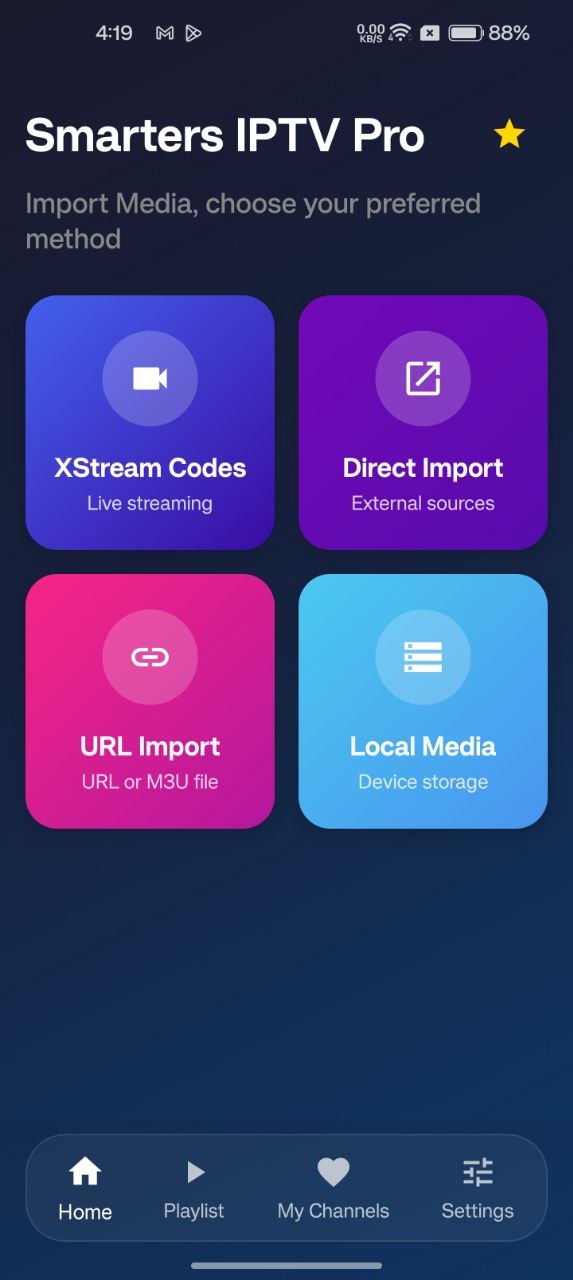 A modern IPTV player for Android with XStream Codes support, M3U playlist import, and a beautiful dark interface designed for the ultimate streaming experience.